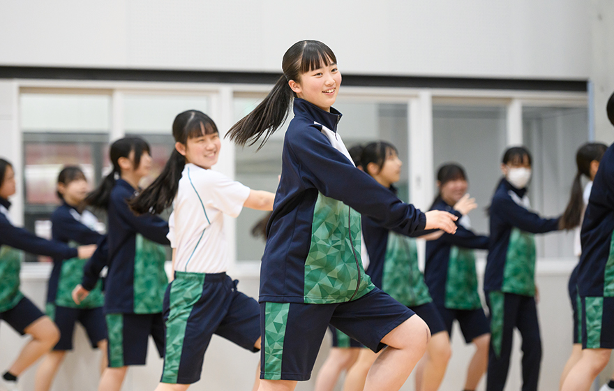 テーマに沿ってみんなで体を使って表現したり、振り付けを考えたりしています。3クラス合同なので、他のクラスの友達とも仲良くなれました。創作したダンスの発表もあります。